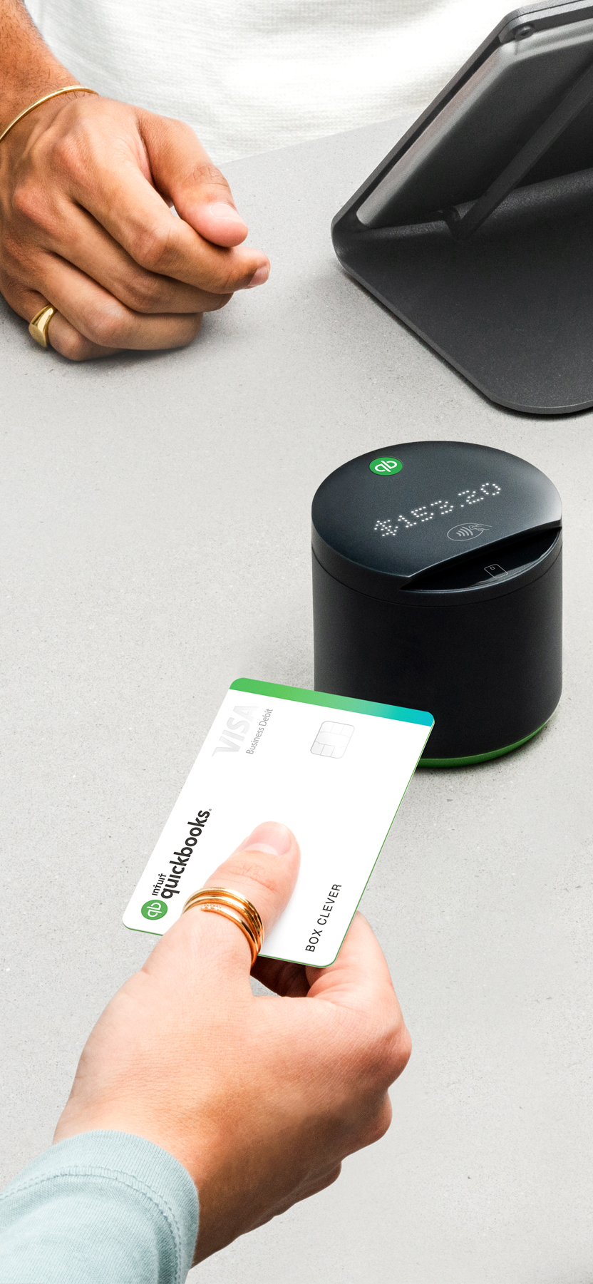 Designing this Card, the new Payments Hardware System, and the Packaging allowed us the opportunity to create a cohesive system. Through visual hierarchy, the card’s design celebrates the Small Business paired with the QuickBooks brand, and introduced a recognizable gradient foil print to signify the Brand and interaction zones of the product in the physical world.